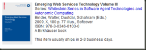 Haciendo una revisión de las contribuciones a la comunidad técnica para el programa MVP, comencé a revisar los artículos y conferencias que he hecho en el año 2009. Me encontré con que se me había olvidado comentar en este Blog que publiqué un articulo junto a Veronica Gacitua-Decar y Claus Pahl en el libro Emerging Web Services Technology Volume III, de la serie Whitestein Series in Software Agent Technologies and Autonomic Computing de Birkhäuser.