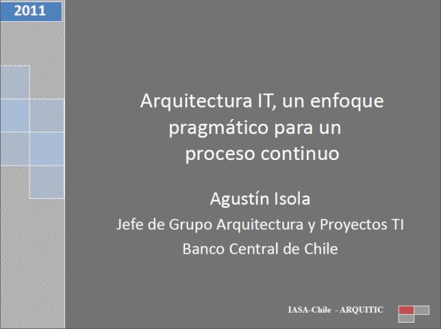 Para esta ocasión, tenemos el agrado de contar con la importante participación del Sr. Agustín Isola, Jefe del Grupo Arquitectura y Proyectos TI en el Banco Central de Chile, con más de 13 años de experiencia en TI del rubro financiero, con basta trayectoria en Arquitectura, ha cubierto cargos como Arquitecto de Integración, Arquitecto de Aplicaciones y Líder de Arquitectura.